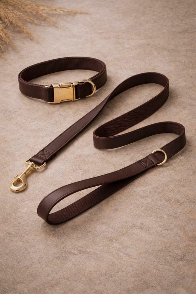Gamelle en cuir marron pour chien, confortable et ajustable, idéale pour un repas élégant et pratique