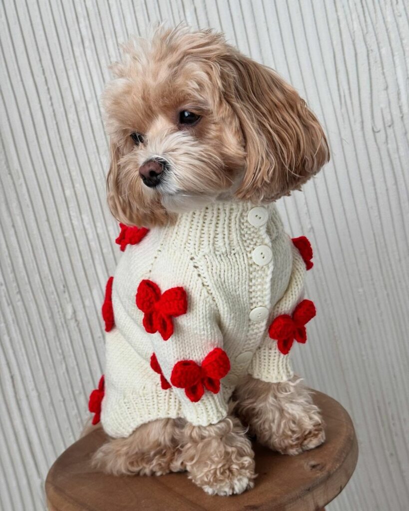 Vêtement d’hiver blanc pour chien, orné de petites fleurs rouges, chaud et confortable pour les saisons froides.